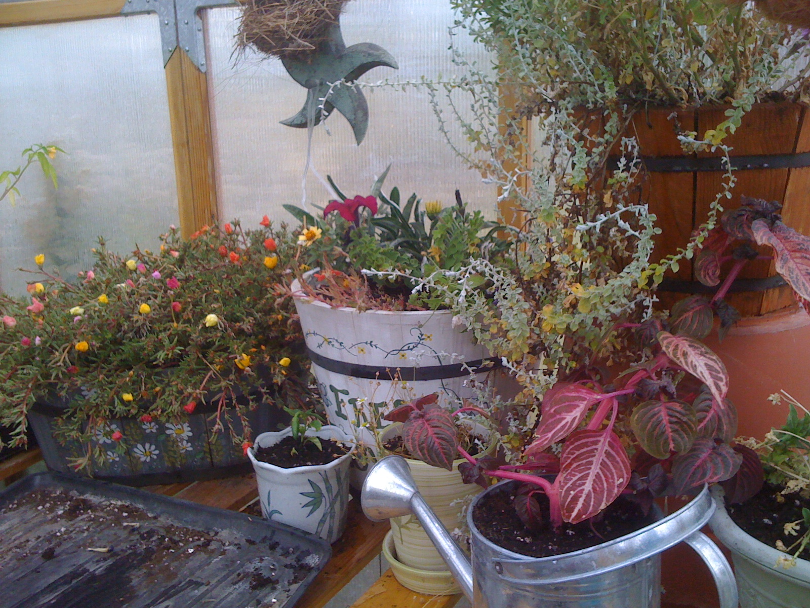 Well yesterday turned out much warmer than we expected. It was in the 40’s and sunny- really felt like spring was on its way! Today started out much the same but the winds picked up, the sun went behind the clouds and the dampness rolled in. Still we are all hopefull that we are turning the corner to the nicer weather! I spent some quality time in the greenhouse. Planting some flower seeds, more herbs and cleaning up pots. I saved some seeds from the pot of moss roses in the picture above. They were given to me to look after from a good friend of mine when she moved. I hope to have a nice pot of flowers from those seeds to give back to her this summer in her new house.