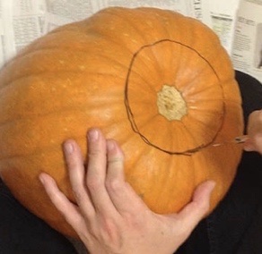 carve the access hole in the bottom your pumpkin. It is easier to clean out, all you do is make your circle, cut that piece out and discard- when it is cleaned and carved… simply place the pumpkin over your light source (I would only recommend battery operated light sources for this application a candle would not work well or be safe), and the top stays in tack with the stem and the bottom is more stable to sit on the light source.